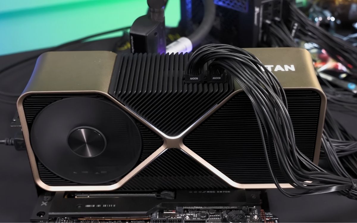 In general terms, the prototype is above RTX 4090 and below RTX 5090. The Titan plate incorporates two 16-pin 12v-2 × 6 connections, but maintains a 450W TGP, indicative that the used BIOS and driver are not properly optimized for such a titanic GPU.